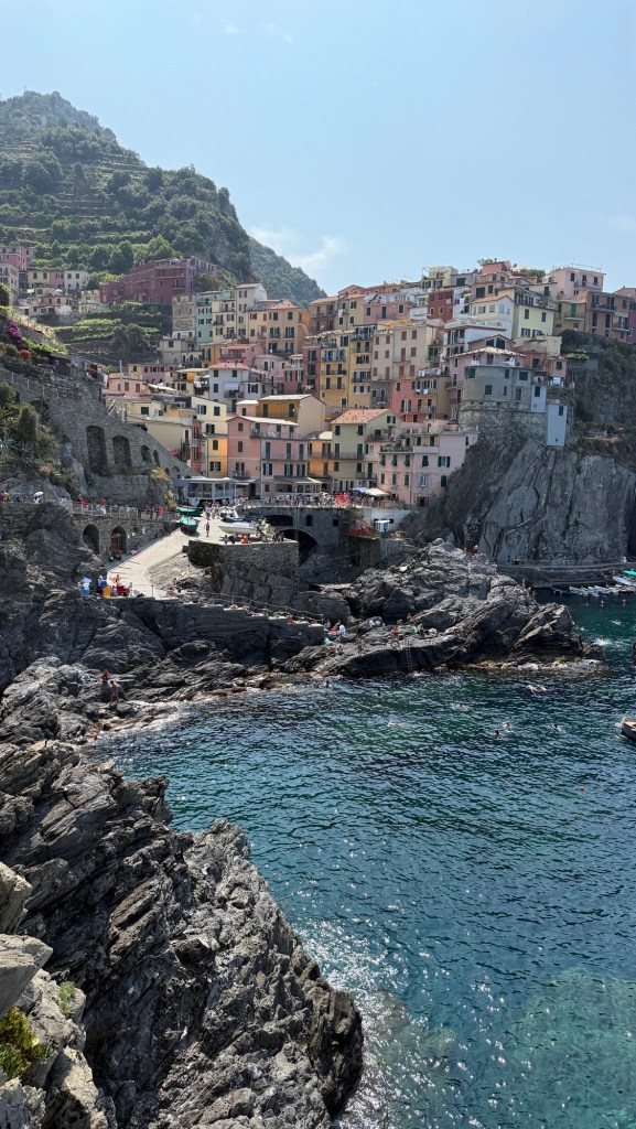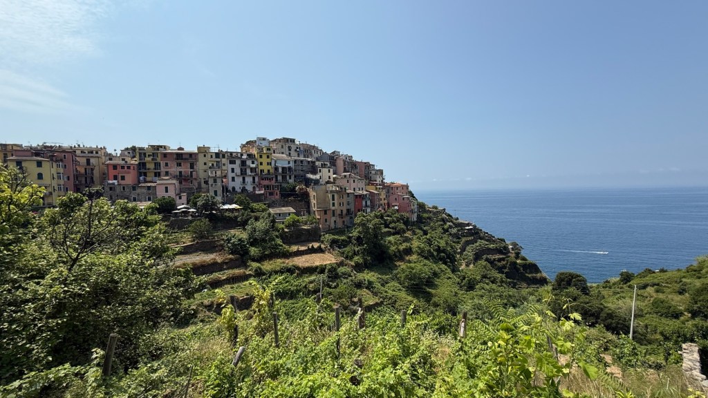 To avoid the morning crowds, we started at Manarola and were immediately enchanted. From there, we took the train to successive stops in Corniglia, Vernazza (of the movie Luca fame) and Monterosso al Mare. [In full disclosure, Kaitlin, Madeline and David hiked the mile-and-a-half between stops 2 & 3 in the 85°, 85% weather. After all five of us climbed the 376 steps to get to Corniglia.]