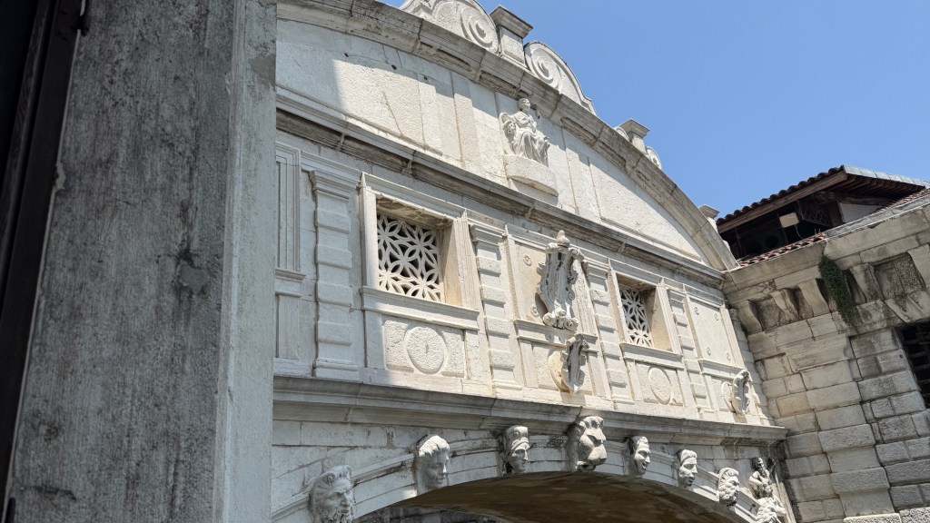 The Doge’s Palace palace included government offices, a jail and the residence of the Doge (Duke) of Venice – the elected authority of the former republic. It was originally built in 810, rebuilt in 1340 and extended and modified in the following centuries. It includes the famous Bridge of Sighs.